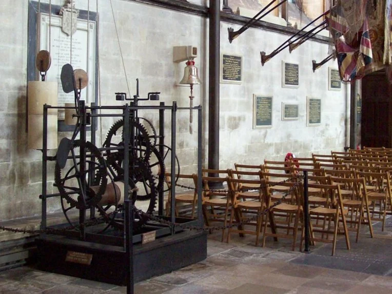 It originally stood in a detached bell tower (near where the Bell Tower Tea Rooms are today) but when that was demolished in 1884, a new clock was installed and the discarded one left to deteriorate. It was rediscovered in 1929, when it was restored and put on public display in the main aisle.